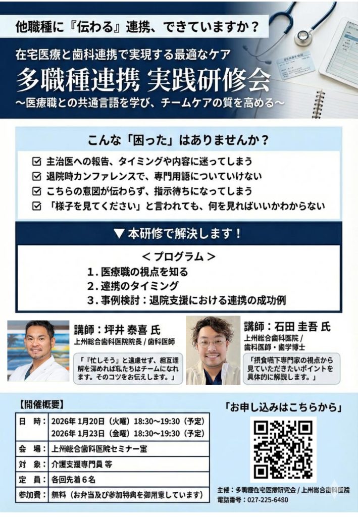 1月20日(火)、1月23日(金)にて多職種連携実践研修会の開催が決定いたしました✨